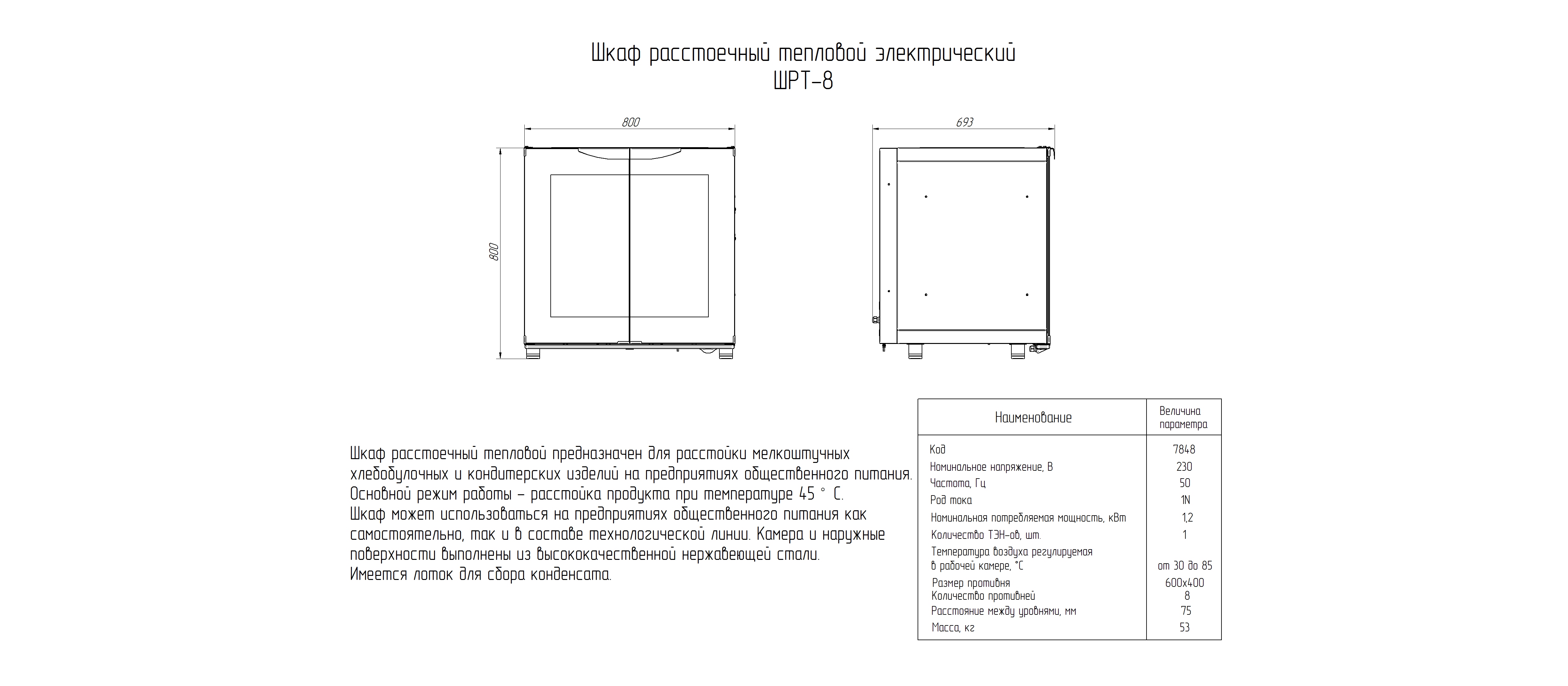 Расстоечный шкаф Abat ШРТ-8 используется в пекарнях, кондитерских и на предприятиях общественного питания и торговли для расстойки тестовых заготовок, в процессе которой тесто увеличивается в объеме и приобретает ровную поверхность, восстанавливается его пористость. Модель оснащена лотком для сбора конденсата и регулируемыми по высоте ножками.